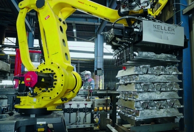 By replacing a fault-prone ingot stacking system with palletizing using industrial robots, downtimes could be reduced and the speed of palletizing the 400°C hot aluminium ingots could be increased. This resulted in a significant increase in the efficiency of the plant, so that the investment costs were amortised after only a short time.