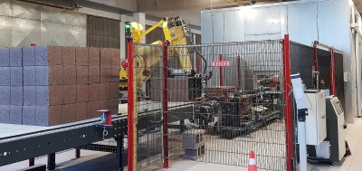 The system consists of two milling stations for face milling, groove milling and chamfer milling. It is able to process the wood-concrete blocks with a maximum capacity of 1450 blocks per hour. The bricks are then grouped and palletized.