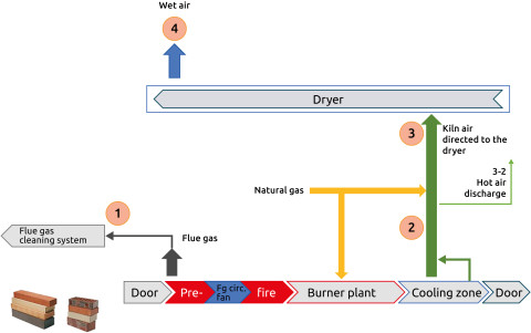 En una fábrica de ladrillos, esto incluye al menos la cantidad de gases de combustión del horno túnel, el aire húmedo del secado y el aire sobrante del horno que se expulsa. Estos flujos de energía pueden determinarse directamente en las tuberías o, en el caso de instalaciones estructuralmente difíciles, mediante mediciones diferenciales antes y después del punto de soplado.