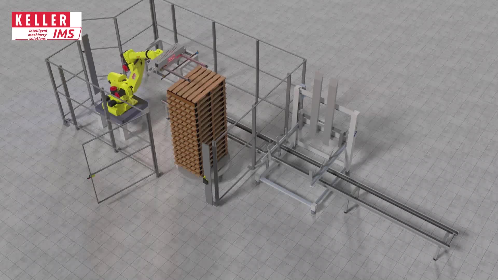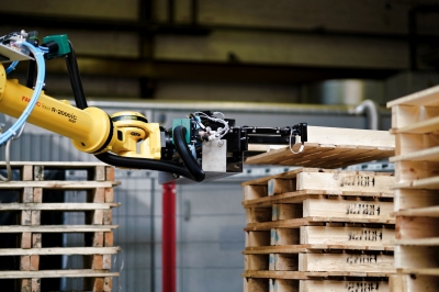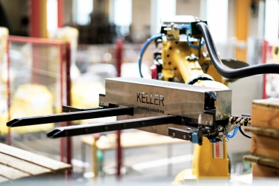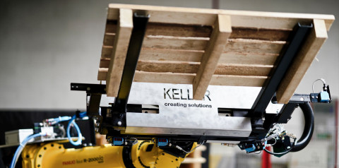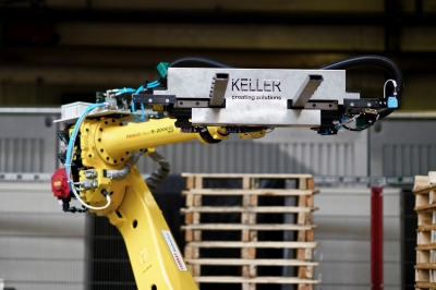 Damit ein Industrieroboter diese Aufgabe übernehmen kann, wurde ein für die Anwendung optimierter Greifer entwickelt. Ein Sensor erkennt bei den zuvor automatisch positionierten und verschachtelten Palettenstapeln die Orientierung der obersten Palette. Entsprechend entnimmt der Greifer diese oberste Palette, richtet die aus und führt sie einem Förderer der Verpackungsanlage zu. Innovativ ist die integrierte Vermessung der Palettenlänge. Bei abweichenden Abmessungen zur Sollpalette wird die Palette automatisch ausgeschleust. Dazu muss der Produktionsprozess nicht mehr unterbrochen werden.